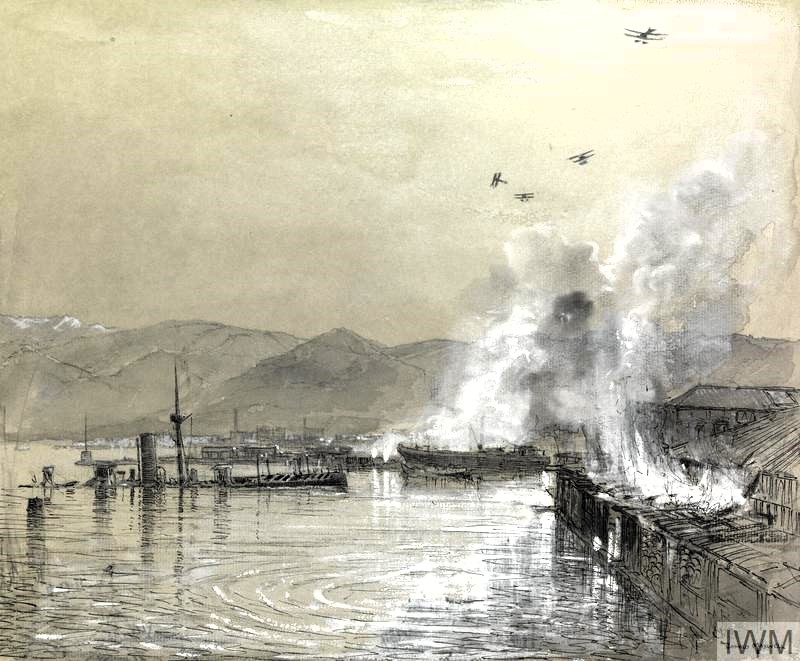 Four Royal Naval Air Service seaplanes are in the sky in the upper right, having dropped bombs that are exploding in the lower right, damaging wooden buildings. There are ships in the harbour, including one that has partially sunk. Mountains are visible in the background.