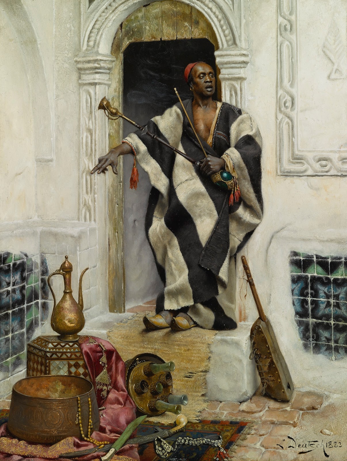 Painted in 1883, the present work is one of the earliest examples of Deutsch’s most iconic Orientalist themes—a single male figure, silhouetted against an architecturally distinctive door or entrance way. The man’s ankle-length black-and-white striped woolen abāya identifies him as an itinerant worker in this Egyptian scene; he is probably a della’l, or broker, hired by one of the local shopkeepers. As the noted nineteenth-century Arabic scholar Edward William Lane (1801-1876) explained, “In many of the nooks of Cairo auctions are held on stated days. They are conducted by delláls, or brokers, hired either by persons who have anything they wish to sell in this manner, or by shopkeepers. The Delláls carry the goods up and down, announcing the sums bidden for them with cries of Harraj, harraj, etc." In Deutsch’s painting, the man gestures emphatically and continues his familiar calls, though he has momentarily set down the eclectic array of goods he has been appointed to vend. More on this painting